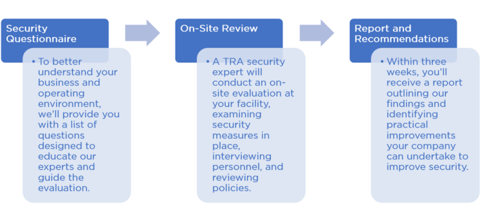 TRA understands the critical need for businesses to allocate resources efficiently, as well as the huge impact even one security incident can have on their operations. A TRASE review balances these often-competing concerns to maximize the security of your employees, customers, and materials.